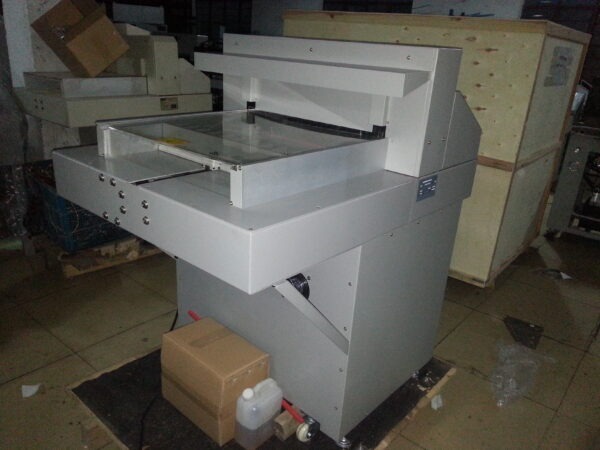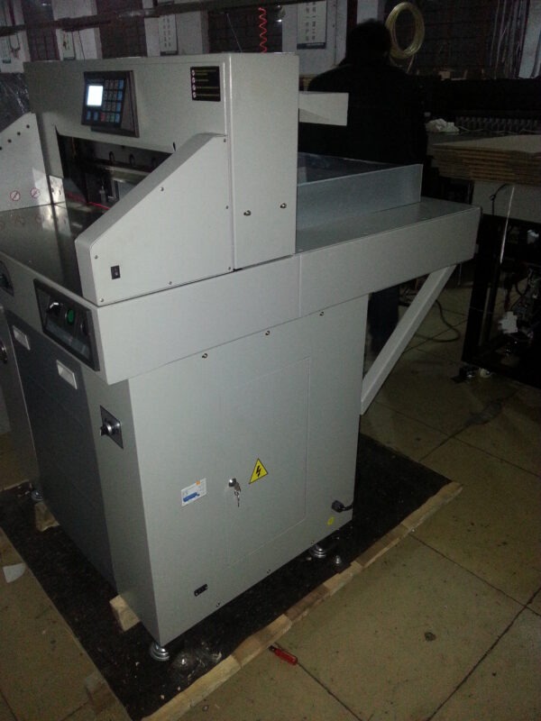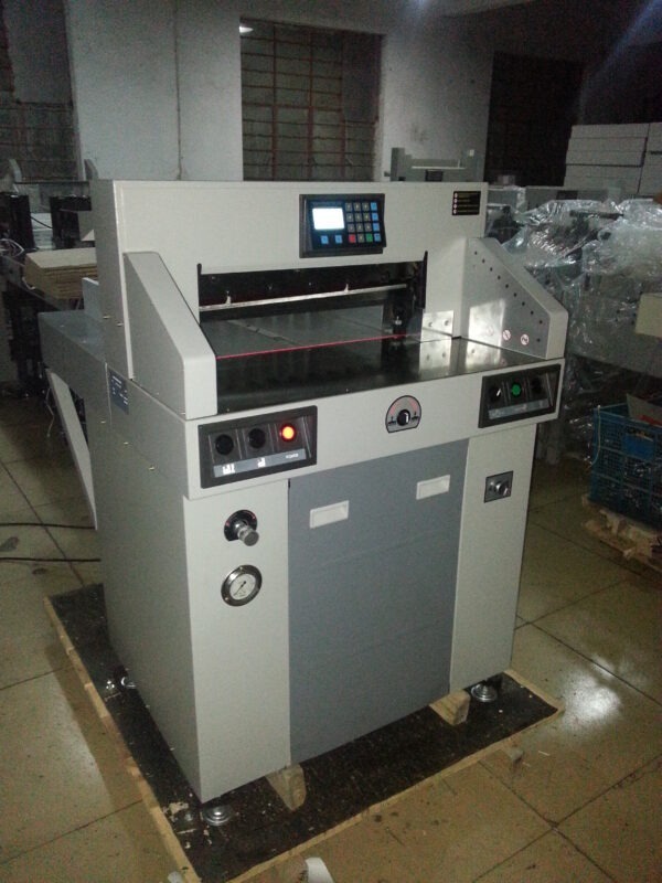 Guillotina hidráulica para papel de procedencia china , programable, con sensores automaticos para proteccion, permite calibrar presion para diferentes gramajes de papel, con luz de corte 520m, con pantalla para medidas de programacion del corte, programa de corte de tarjetas automatico, corte minimo 30mm, altura 65mm,sistema de prensado hidráulco mas pedal electromecanico, programable, display LCD, 220 voltios, peso 400kgms, Dimensiones: 1280x1010x1430mm