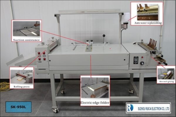 Maquina para armar tapadura de libros , con sistema de doblado electrico de bordes, y prensado, tamaño de la mesa trabajo 980x466mm, t amaño maximo papel A3+, ancho de engomado 500mm, ancho de rodillos 500mm. Tiene la opcion de trabajar separadamente las unidades de colamido, prensado, doblado de bordes o mesa de armar el libro.